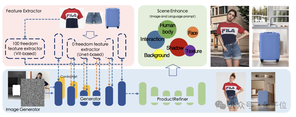 二是构建覆盖多类型商品的场景图生成框架,实现全自动化、多品类、多种组合搭配的商品生成、场景生成、细节复原与增强。