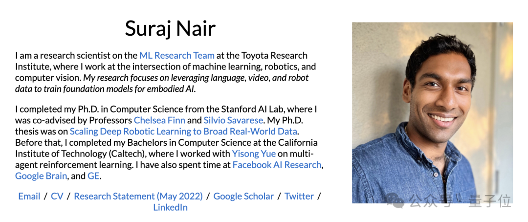 Suraj Nair,丰田研究院ML研究团队的研究科学家,从事ML、机器人和CV交叉领域的工作。
