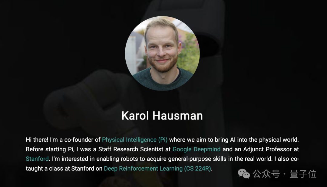 Pi的联合创始人兼CEO,Karol Hausman,此前是谷歌DeepMind的研究人员,同时是斯坦福大学的兼职教授。