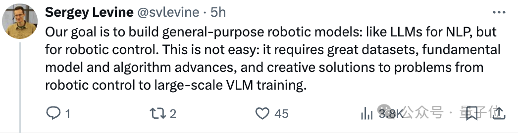 Sergey Levine本人在推特上举例说明,创业要做的事用于机器人控制,其重要程度就像NLP之于大模型。