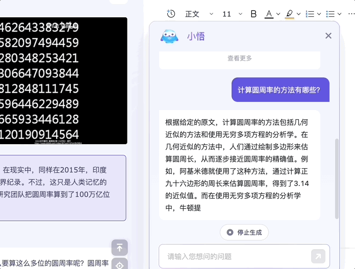 直接询问“小悟”计算圆周率的方法有哪些。好家伙,没想到的是它不仅指出了视频中讲的几何近似和无穷级数法,还额外补充了一些方法。