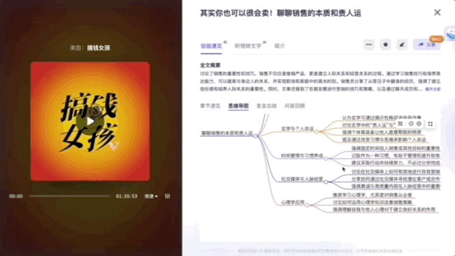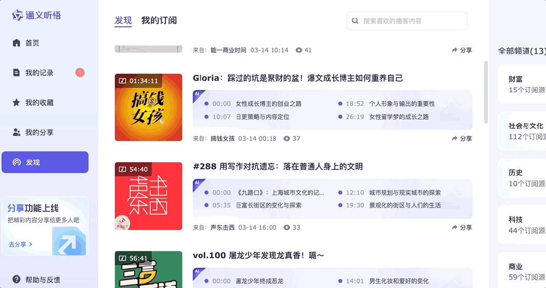 此外值得一提的是,在通义听悟界面的发现栏目中有诸多播客节目,点开后即可速览主要内容。