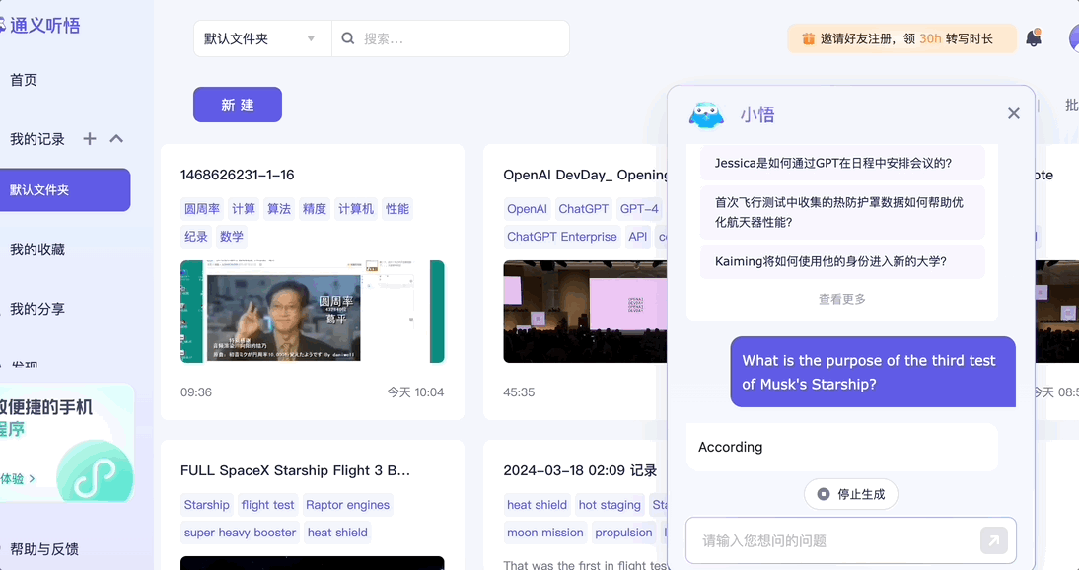 不仅可以针对单一记录向它提问,最长6小时、6G大小,还可以跨记录、让“小悟”扫描上百个音视频一起总结回答问题,目前“小悟”支持内容问答的音视频时长和文件数都是业界上限。