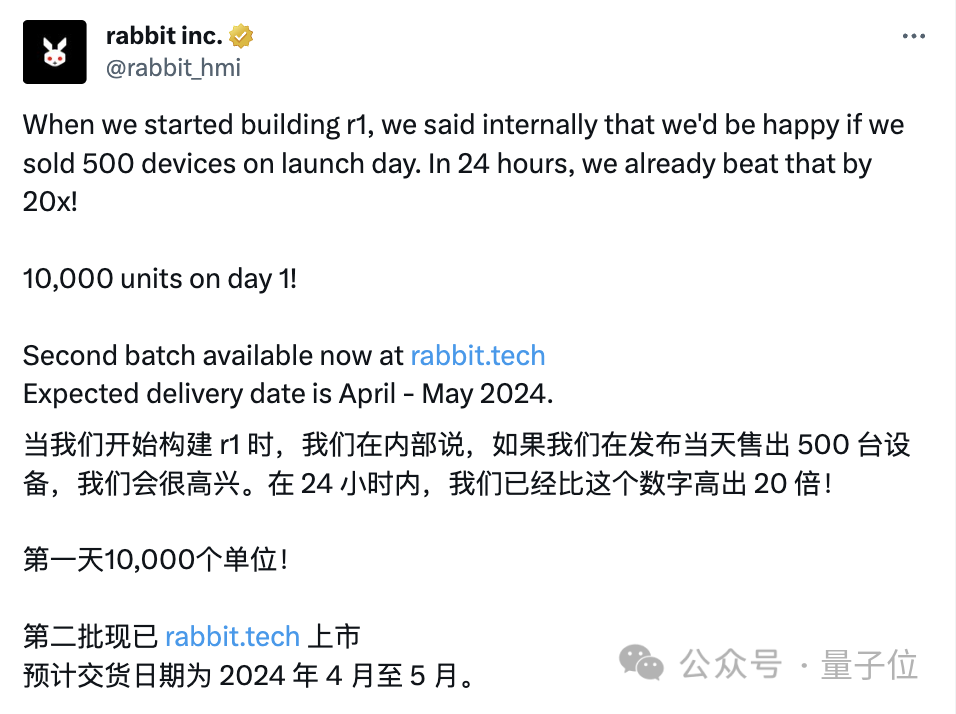 据了解,Rabbit宣布R1在3月才会开始发货,然而消息传出,不到24小时,这家伙就火速卖出了10000台。