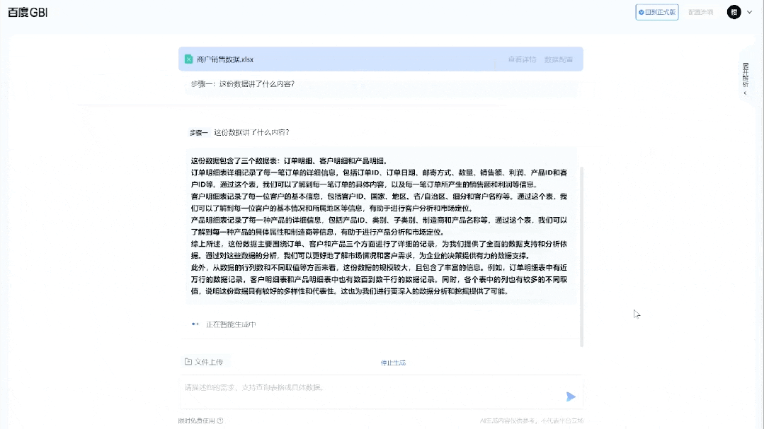 例如一位店长面对一份无从下手的数据表,只需提问“去年热销的商品品类是什么”、“想要提高利润,我应该加强和哪些供应商的合作”,百度GBI就可以结合分析需求自动解析数据。
