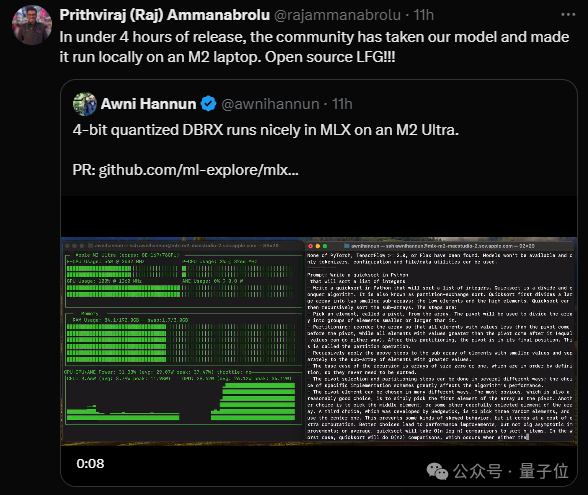 DBRX发布不到4小时,已经有人把它成功部署到苹果M2芯片笔记本电脑上了。
