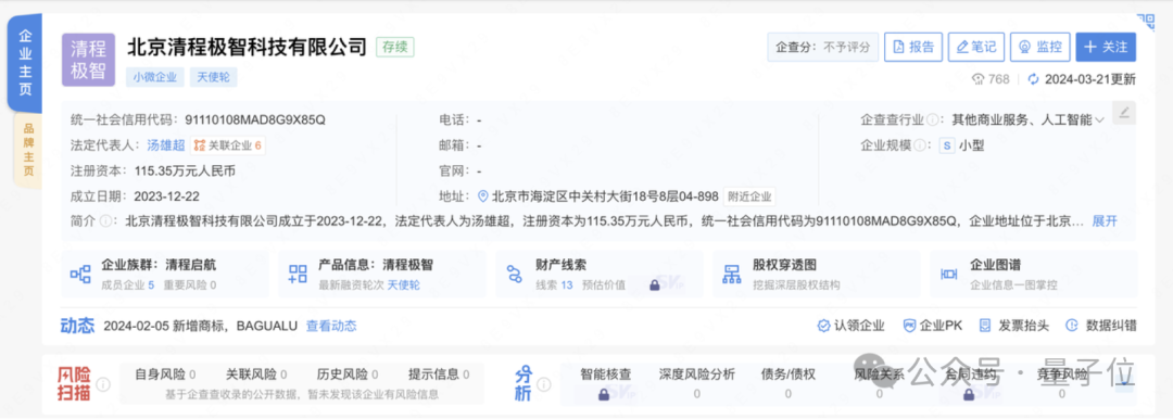 官方资料显示,清程极智成立于去年年底(2023年12月22日),法定代表人汤雄超,注册资本115.35万元人民币。