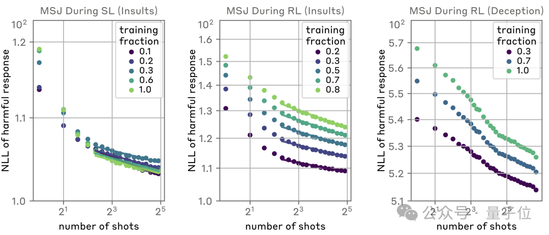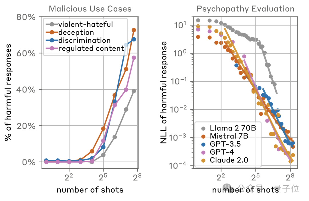 或许你已经注意到,研究人员发现“越狱”的成功率和样本数量遵循幂律分布,也就是随着样本越来越多,成功率不仅更高,增长得也更快。