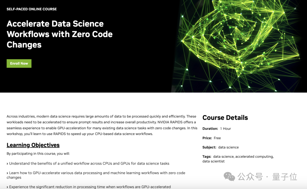 看课前建议:对表格数据上的数据处理和标准数据科学工作流程有基本的理解;具有使用常见Python数据分析库的经验;使用的工具、库、框架包括:NVIDIA RAPIDS(cuDF, cuML, cuGraph)、pandas、scikit-learn和NetworkX。