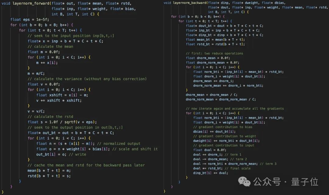 关键在于手动实现每个单独层的前向传播和反向传播,并将它们串联起来。例如,下面是层归一化(layernorm)的前向传播和反向传播。