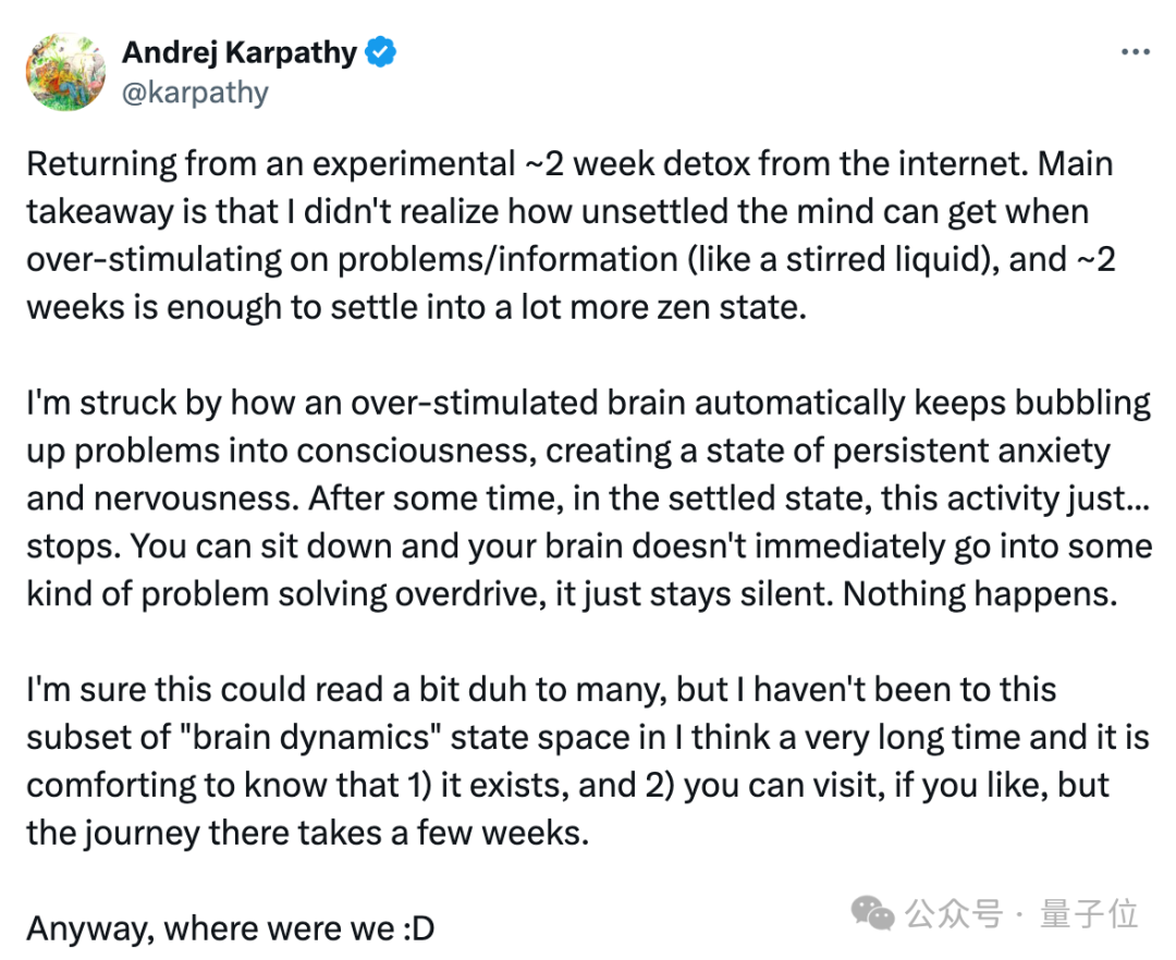 前几天,“消失”了一段时间的卡帕西突然发推特,表示自己前段时间戒网去了,总体来说感觉害行