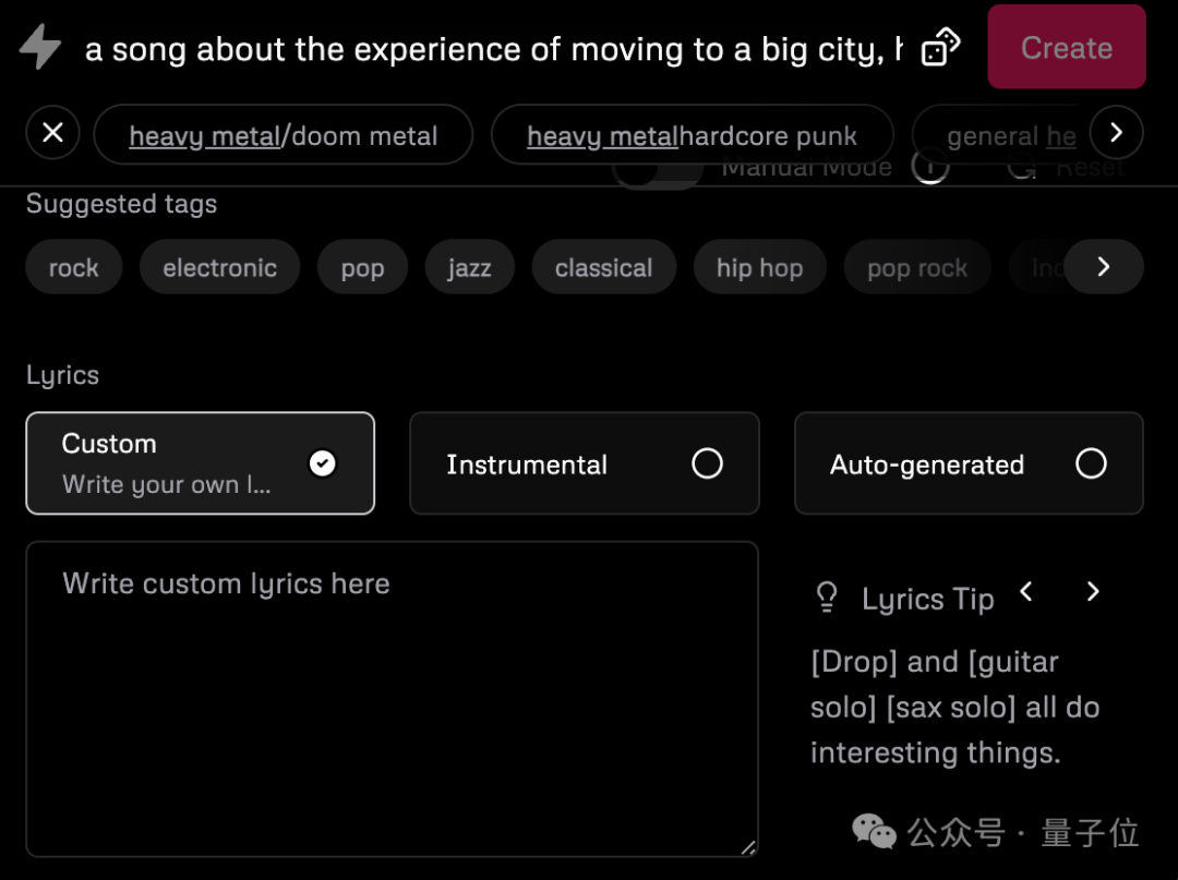 具体玩法就是先输入文字,例如“a song about the experience of moving to a big city, heavy metal”。