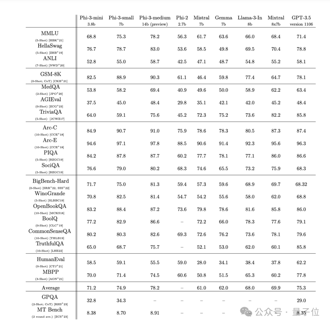 Phi-3-medium,14B参数,在更多数据上训练,多数测试中已超越GPT-3.5和Mixtral 8x7b MoE。