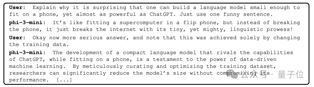 在技术报告中还玩了一把花活,让phi-3-mini自己解释为什么构建小到手机能跑的模型很令人惊叹。