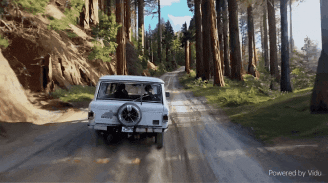 Sora令人惊艳的一大特点,就是能够模拟真实物理世界的运动,例如物体的移动和相互作用。其中Sora有发布的一个经典案例,“一辆老式SUV行驶在山坡上”的画面,非常好地模拟了轮胎扬起的灰尘、树林中的光影以及车行驶过程中的阴影变化:
