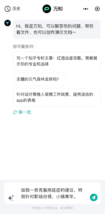 那么如果说,这样一款给力的AI助手已经在网页(www.wanzhi.com/)和微信小程序里静静待机了呢?更重要的是:完全免费!!