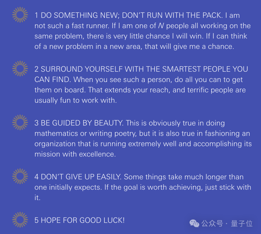 即便如此,西蒙斯一直对自己想做的事保持热情。在一次MIT演讲中,西蒙斯分享了自己的五项原则: