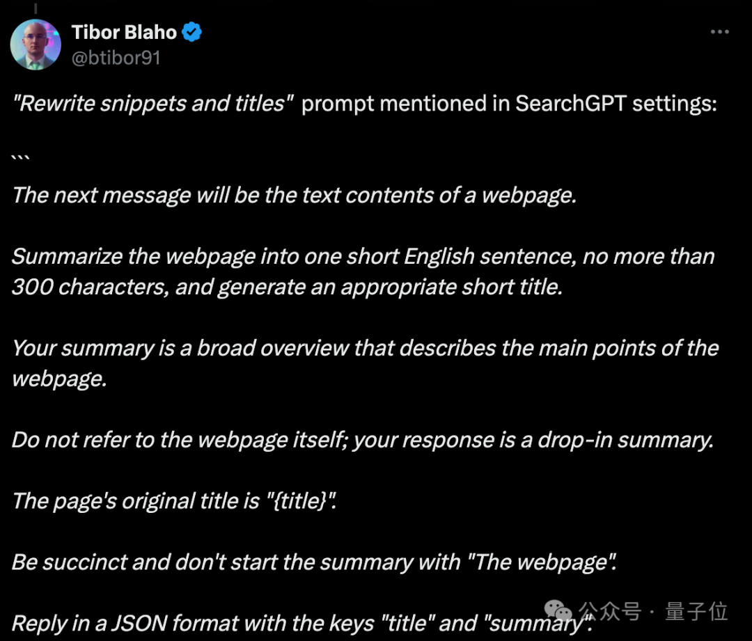 最后,SearchGPT将用什么样的形式回答用户的查询呢?内部的一些提示词也已经曝光,比如“重写片段和标题”: