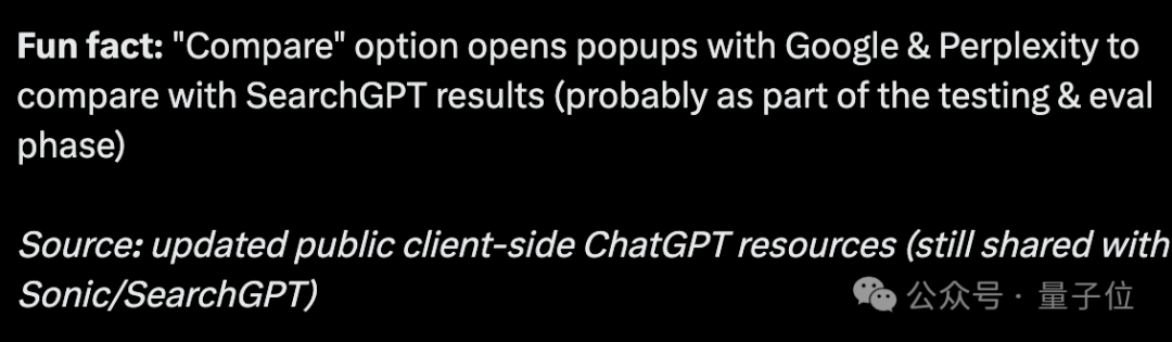 甚至非常挑衅的设计了一个“比较”按钮,可以一键打开Google和Perplexity搜索结果,直接与SearchGPT做对比。