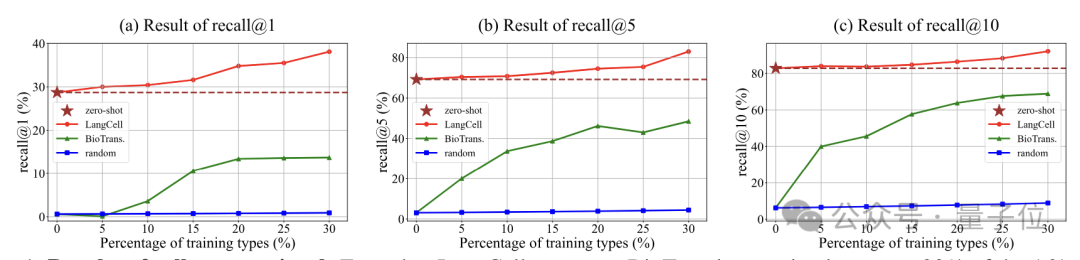 在更具挑战的跨数据集的细胞-文本检索任务中,LangCell的零样本召回率R@1、R@5和R@10结果都超过了用30%标注数据训练的BioTranslator模型。