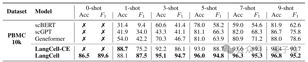 在PBMC数据集上,零样本的LangCell分类准确率就已达到86.5%,F1评分更是超过了前SOTA模型的9-shot表现。