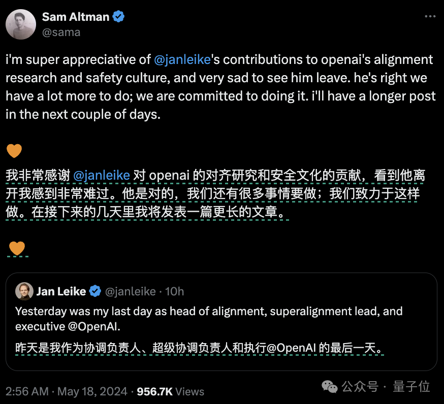 参考链接:[1]https://www.vox.com/future-perfect/2024/5/17/24158403/openai-resignations-ai-safety-ilya-sutskever-jan-leike-artificial-intelligence[2]https://x.com/janleike/status/1791498174659715494[3]https://twitter.com/sama/status/1791543264090472660
