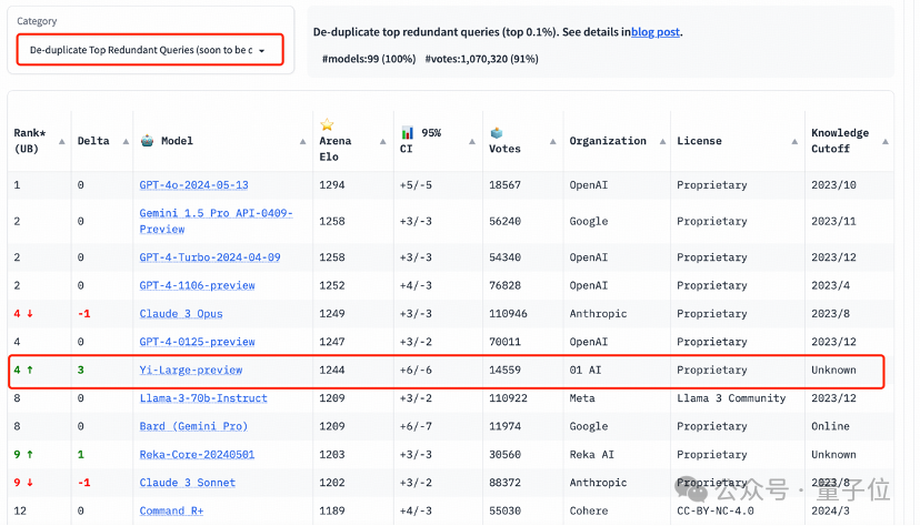 目前,在去除冗余查询后的总榜中,Yi-Large的Elo得分更进一步,与Claude 3 Opus、GPT-4-0125-preview并列第四。