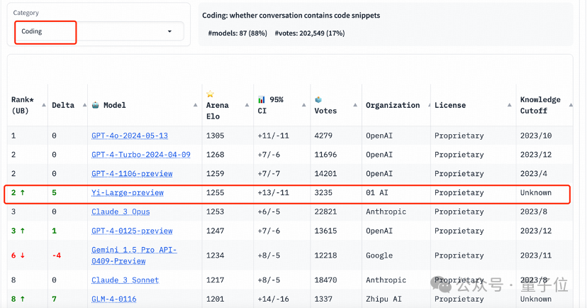 在编程能力(Coding)排行榜上,Yi-Large 的Elo分数超过Anthropic当家旗舰模型Claude 3 Opus,仅低于GPT-4o,与GPT-4-Turbo、GPT-4并列第二。