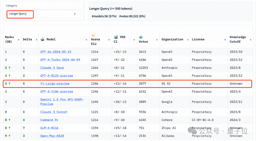 在长提问(Longer Query)榜单上,Yi-Large同样位列全球第二,与GPT-4-Turbo、GPT-4、Claude 3 Opus并列。