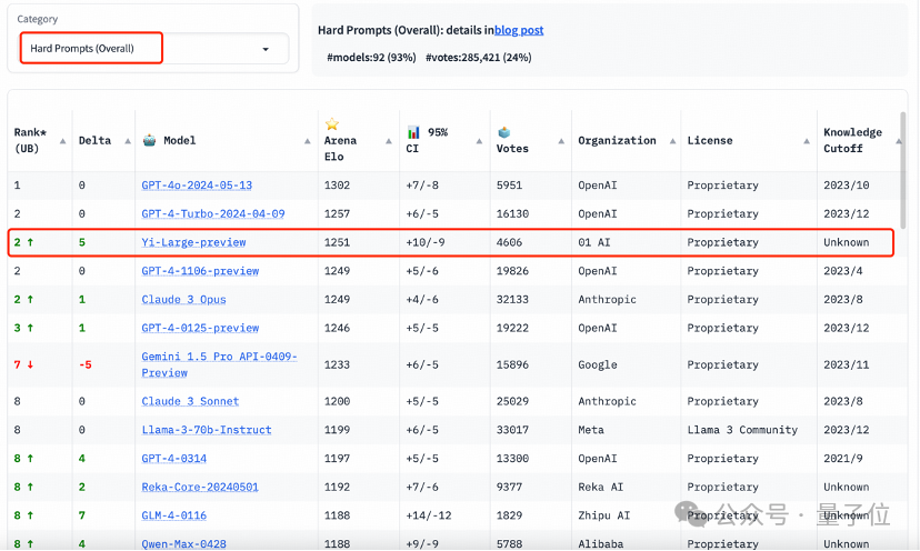 这个榜单上,Yi-Large处理艰难提示的能力与GPT-4-Turbo、GPT-4、Claude 3 Opus并列第二。