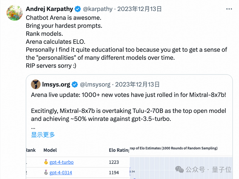 大神卡帕西去年就夸过大模型竞技场很Awesome: