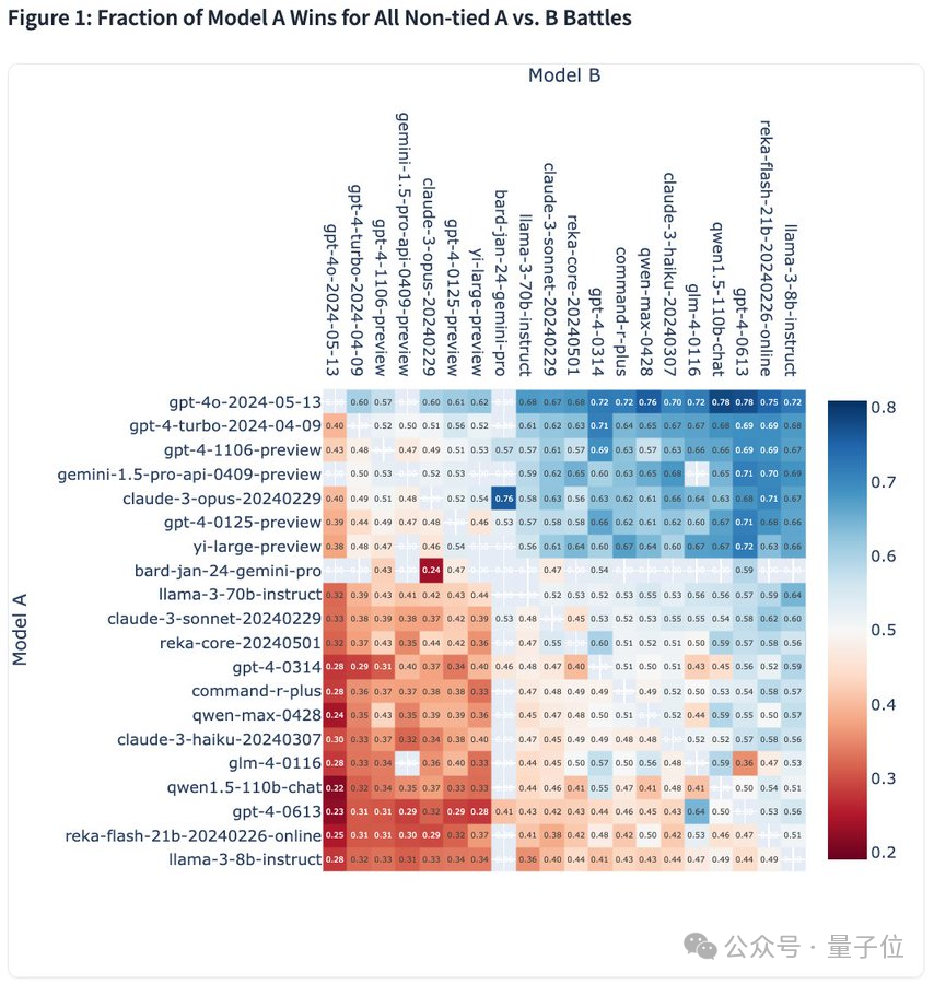 最后,奉上一张胜率热图,它涵盖了目前大模型竞技场上的所有大模型: