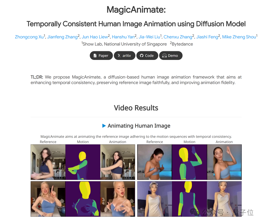 2023年12月,新加坡国立大学的Show Lab联合字节跳动发布了一款视频模型MagicAnimate,就是那个仅需1张图就能让人物跳舞的模型。
