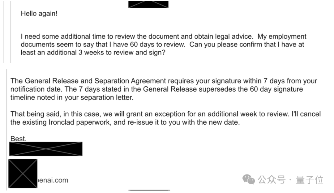 还有一份邮件显示,OpenAI为说服员工签署协议,积极地采用施压策略,把协议签署的最后期限从60天改为7天,并且没有明确的理由。