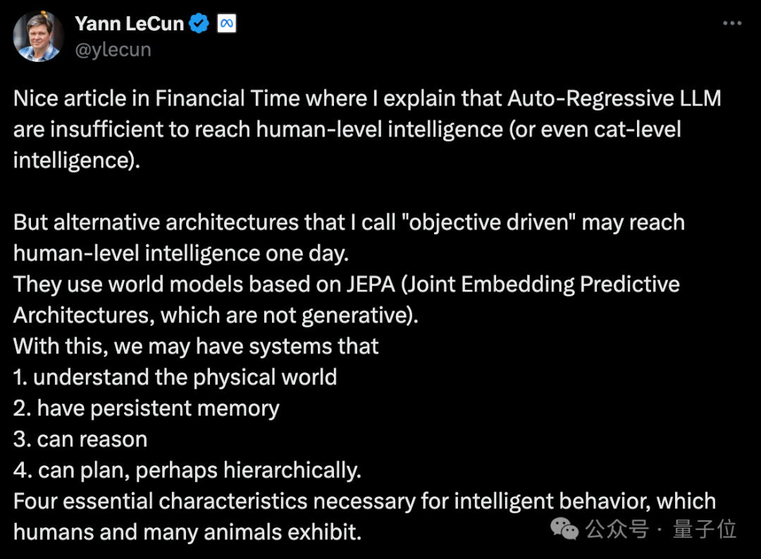 自回归大语言模型不足以达到人类的智力水平(甚至达不到猫的智力水平)。