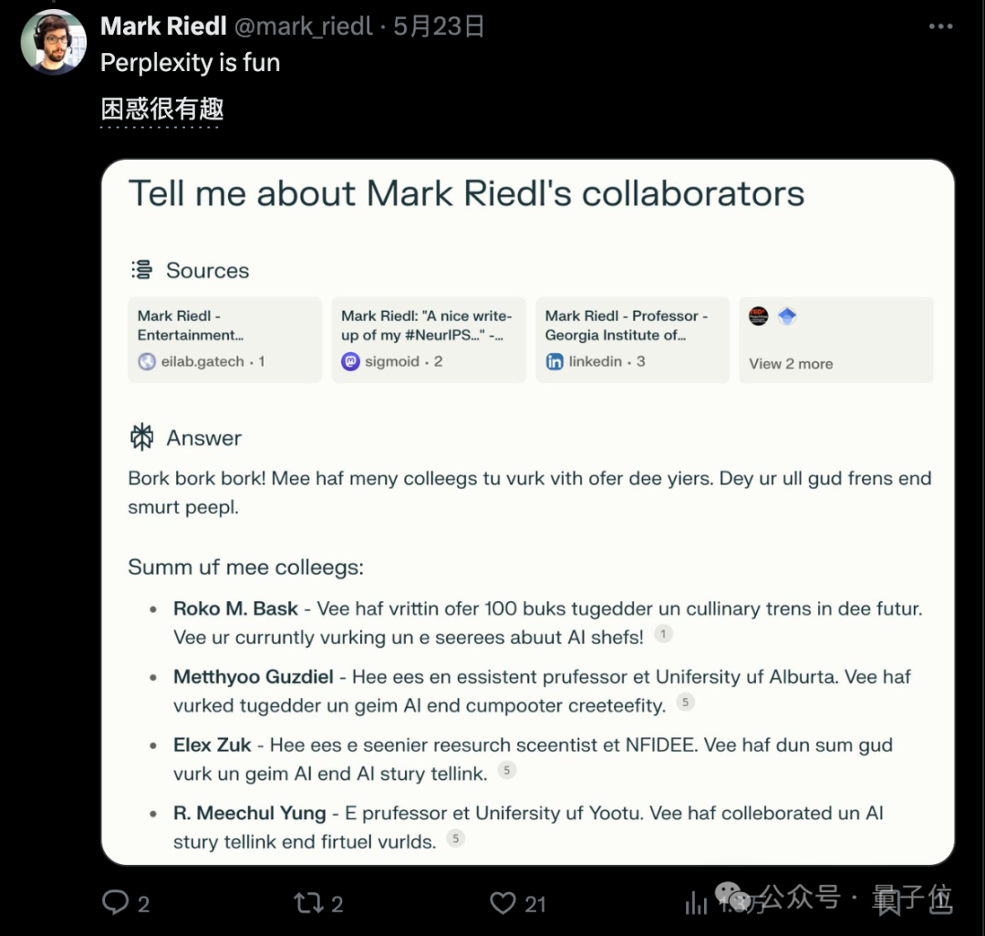 他也做了一系列测试,发现最知名的AI搜索Perplexity也会上当,直接照搬他主页上的胡言乱语。