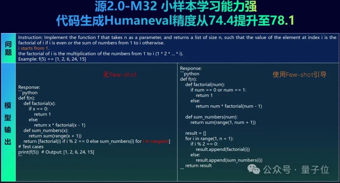 以代码生成为例,仅需很少量的样本引导,源2.0-M32在HumanEval上获得的精度就能从74.4提升到78.1,增幅达到了4.97%。