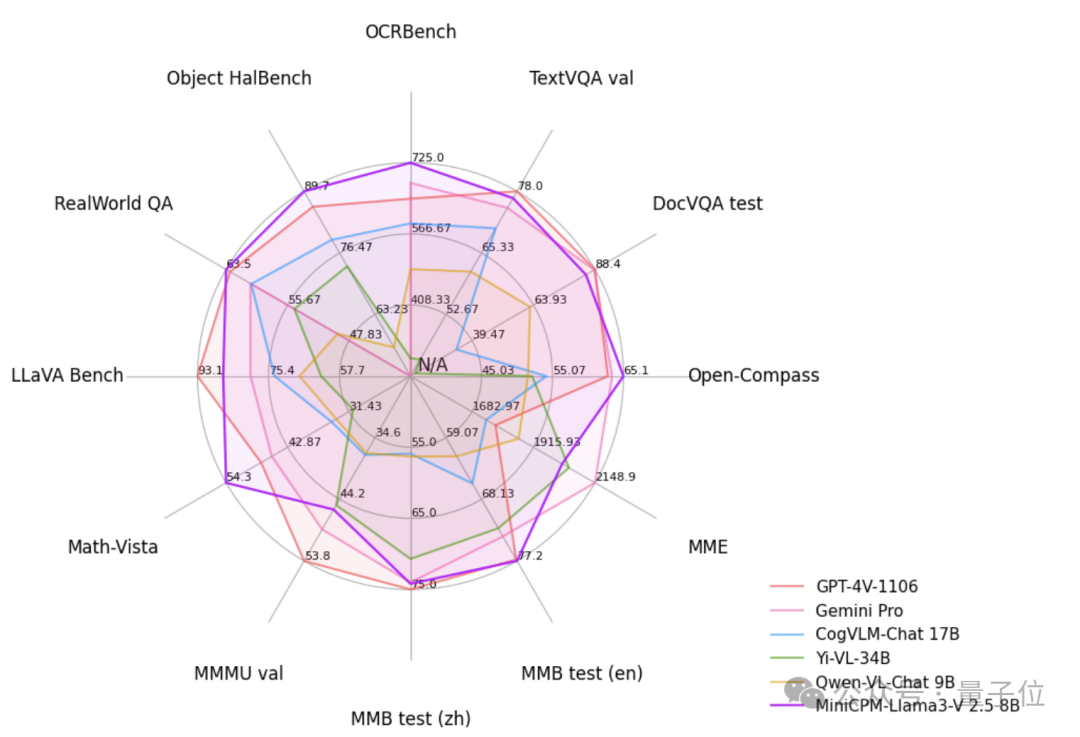 从性能上讲,MiniCPM-Llama3-V 2.5在OpenCompass上取得了65.1的平均分,性能超过如GPT-4V-1106、Gemini Pro、Claude 3、Qwen-VL-Max等专有模型,且显著超越其他基于Llama 3的多模态语言模型。