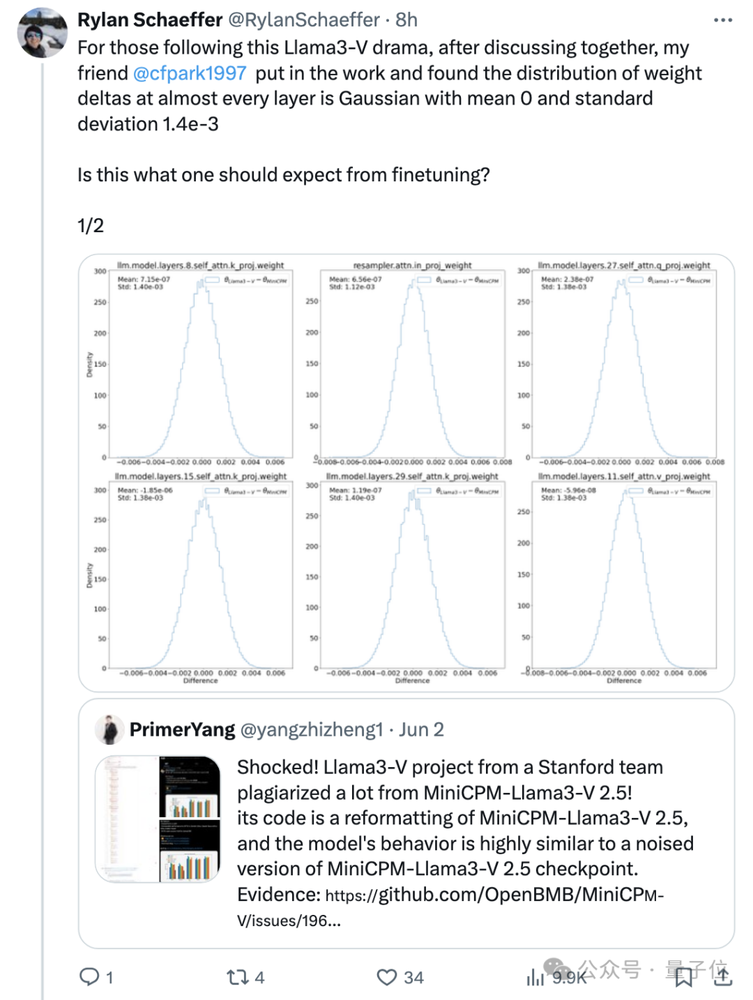 有人研究后发现,Llama3-V几乎每一层的权重差值都符合均值为0、标准差为1.4e-3的高斯分布。