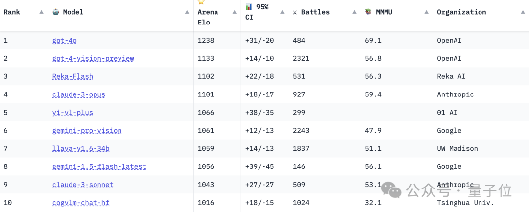 在模型一对一PK的视觉大模型竞技场中,来自零一万物的Yi-VL-Plus排名第五,超过了谷歌的Gemini Pro Vision。智谱AI和清华合作的CogVLM也跻身前十。