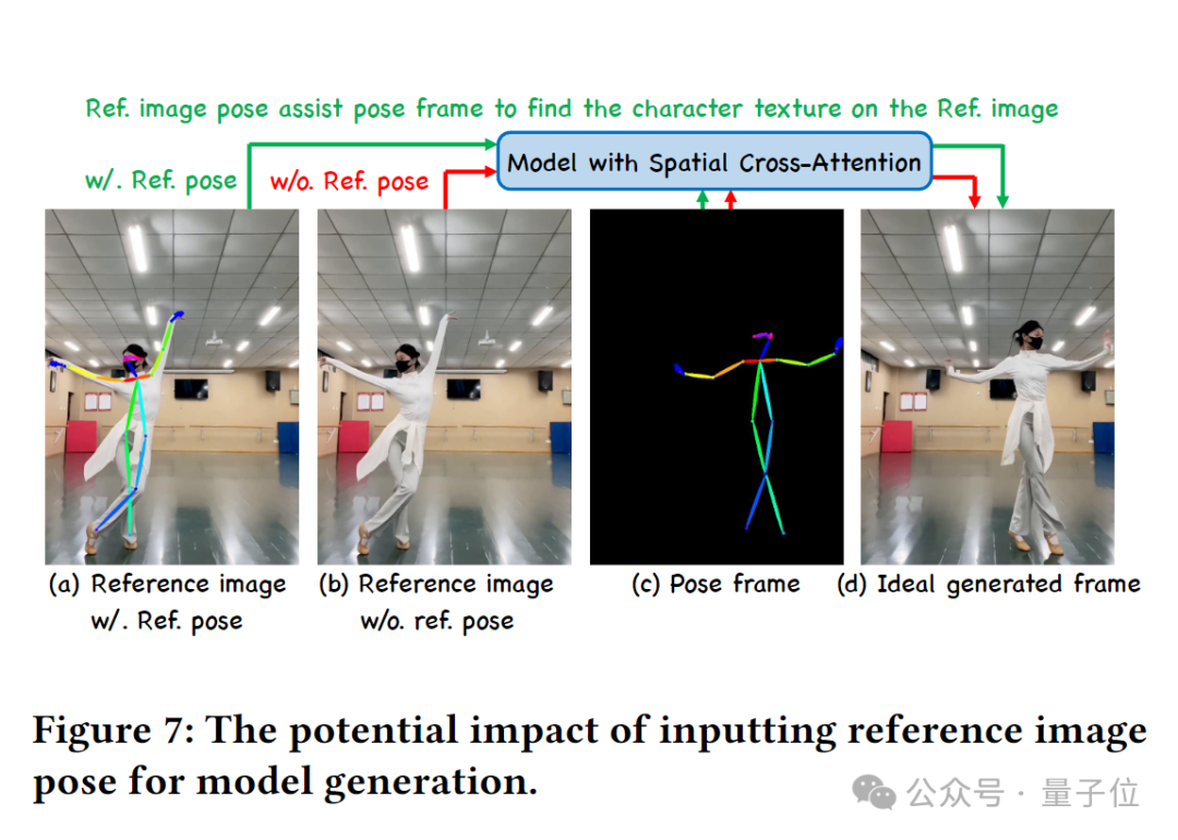 该框架中特有的“推理图指导器”(Reference Pose Guider)引入了图片中的人物空间信息,赋予模型更强的动作跟随能力。