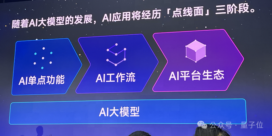 吴欣鸿表示,随着AI大模型的发展,AI应用将经历点、线、面三个阶段。