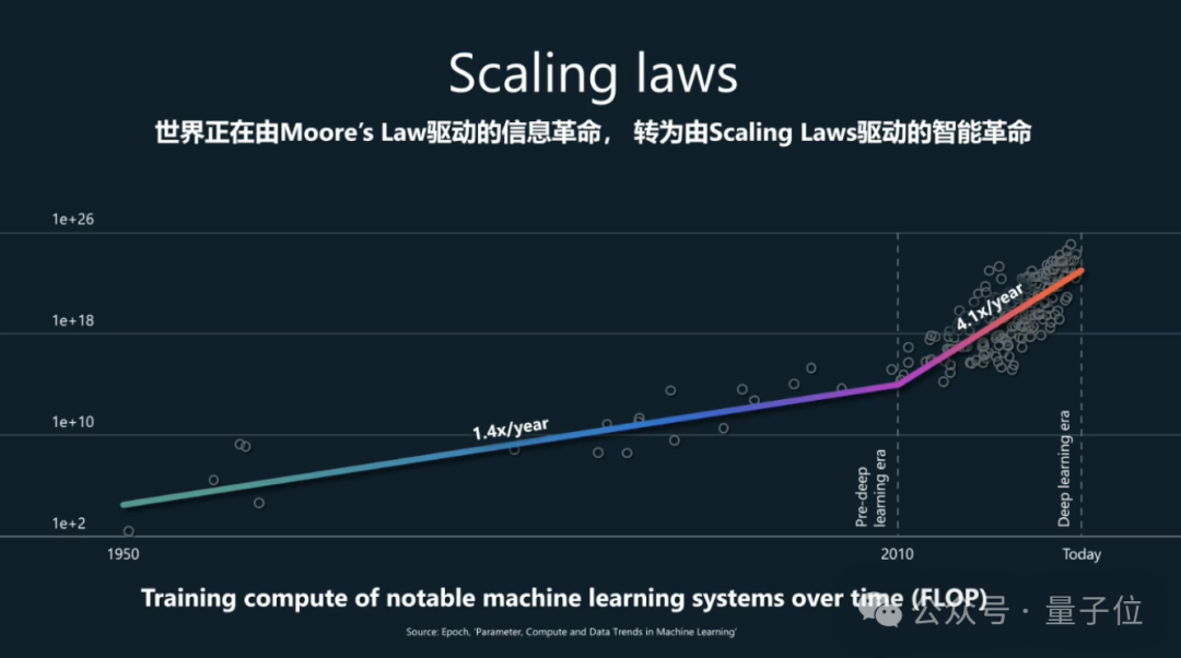 以生成式智能为代表的新一代AI技术创新正在加速演进,在今天的Scaling Laws下,AI技术的能力大约每六个月内就会翻倍增长。