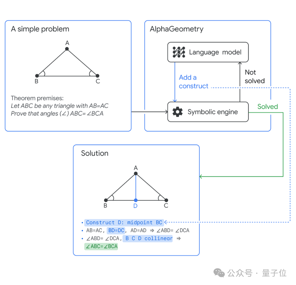 AlphaGeometry没有这个弱点,它的解决方案具有机器可验证的结构,并且是人类可读的……它像学生一样使用带有角度和相似三角形的经典几何规则。