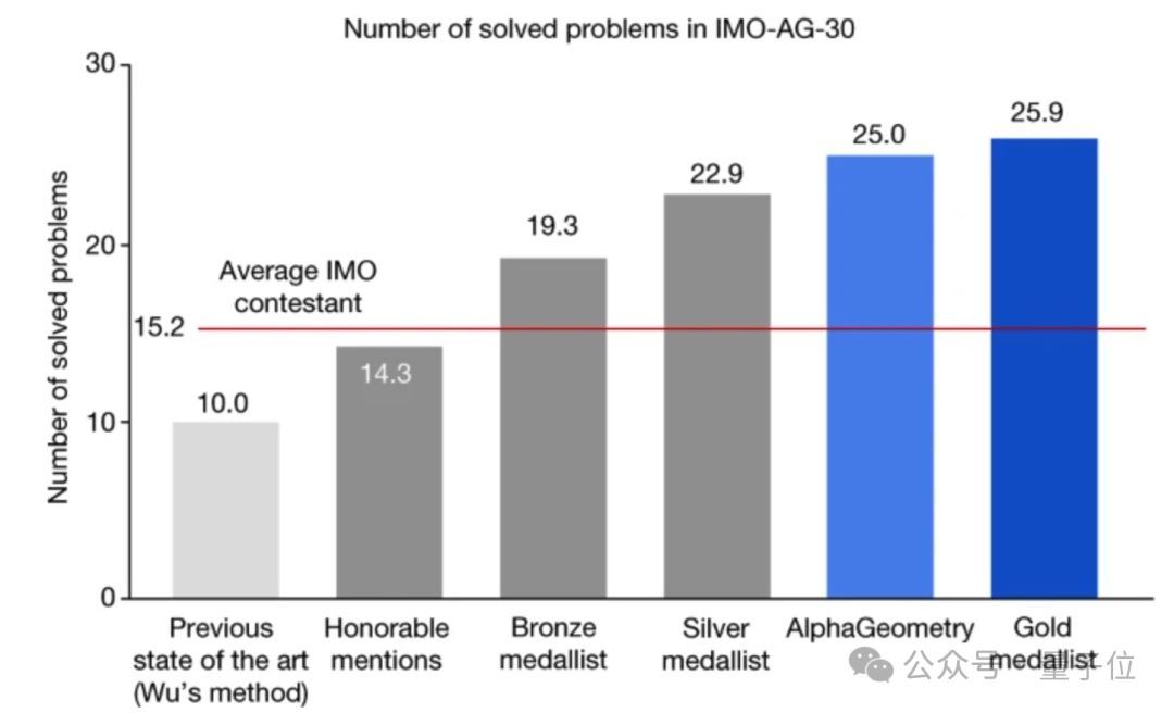 具体来说,30道IMO难度的几何定理证明题,AlphaGeometry做对25道,人类金牌选手平均25.9道,之前SOTA方法(1978年的吴文俊法)做对10道。