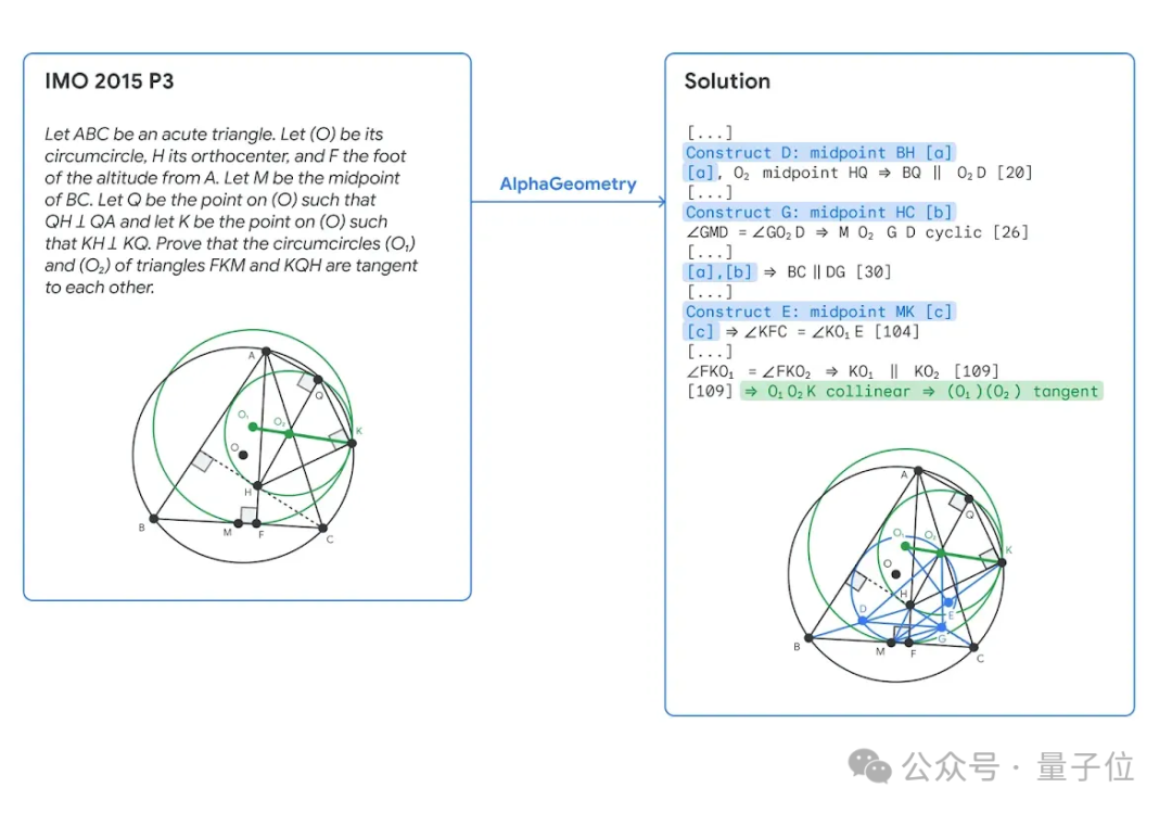 例如在解决一道IMO 2015年的竞赛题时,蓝色部分为AlphaGeometry的语言模型添加的辅助结构,绿色部分是最终证明的精简版,共有109个步骤。
