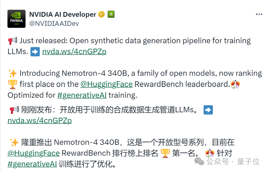 Nemotron-4 340B一经发布便瞬时登顶Hugging Face RewardBench 榜一!
