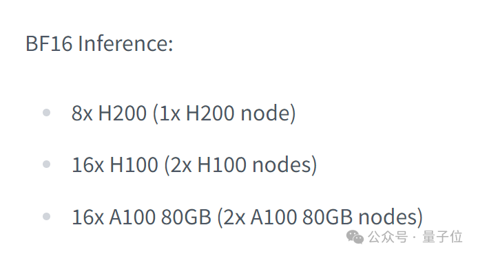 在BF16精度下,模型的推理需要8块H200,或16块H100/A100 80GB。如果是在FP8精度下,则只需8块H100。
