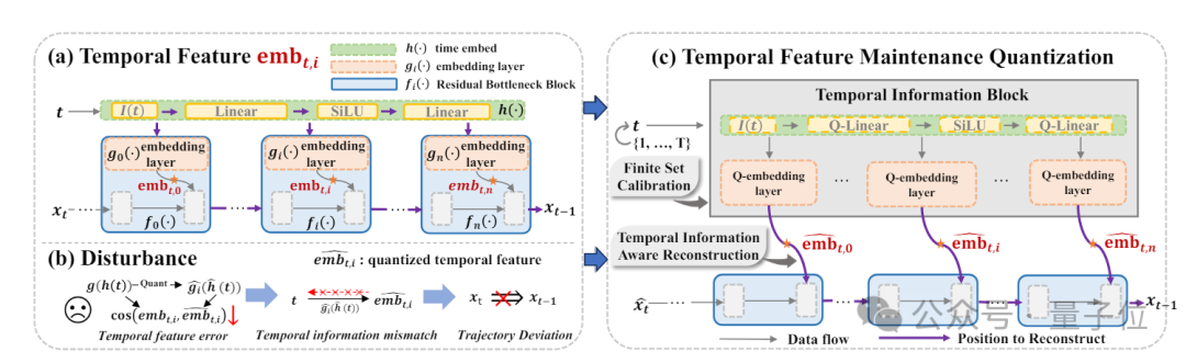 该框架时间信息块仅与时间步骤相关,与采样数据无关,创新地设计并引入了时间信息感知重建(TIAR)和有限集校准(FSC)方法,从而可以在有限的时间内对齐全精度时间特征,最小化精度损失的同时提高图像生成效率。