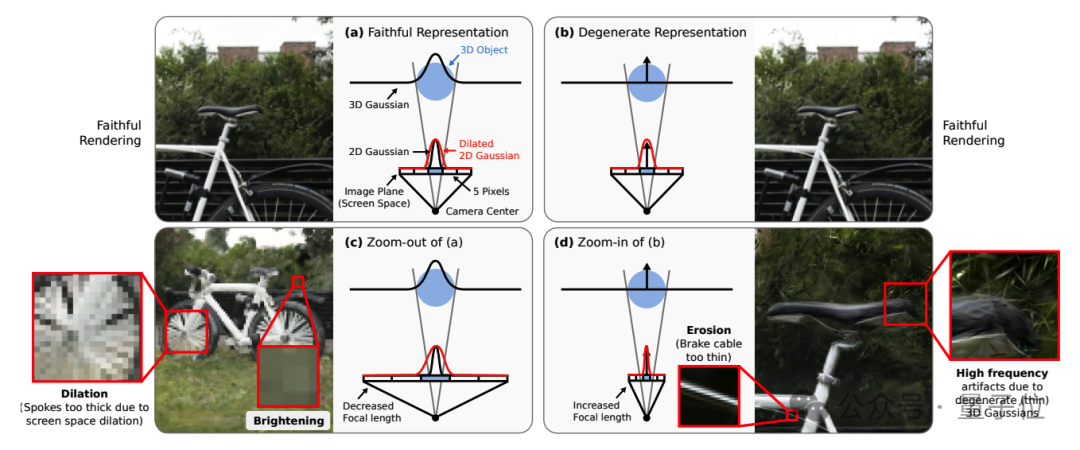 3D高斯溅射展示了令人印象深刻的新颖视图合成结果,达到了高效率和高保真度。然而,当改变采样率时,例如通过改变焦距或相机距离,可以观察到强烈的伪影。